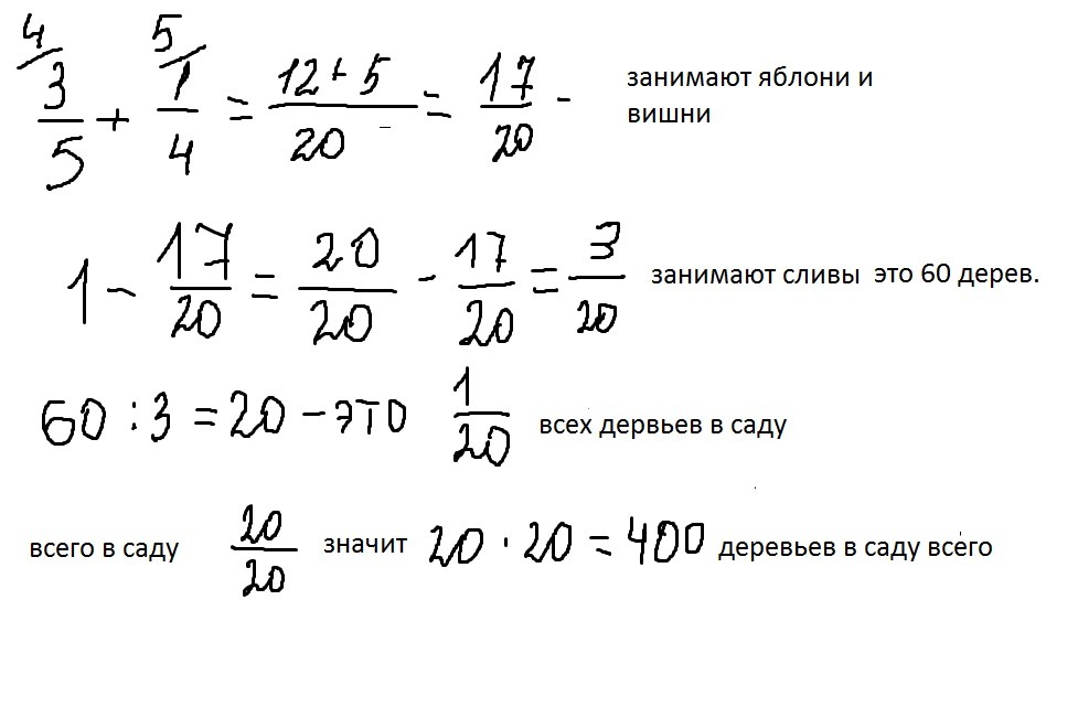 яблони занимают 3/5сада ,вишни -1/4 сада,остальные 60 деревьев -сливы.сколько всего деревьев в саду.