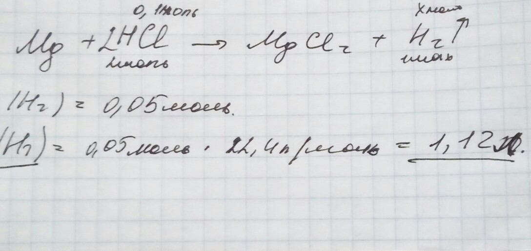 какой объем (н.у.) водорода образуется при взаимодействии металлического магния с соляной кислотой,содержащей HCl химическим количеством 0,1 моль?