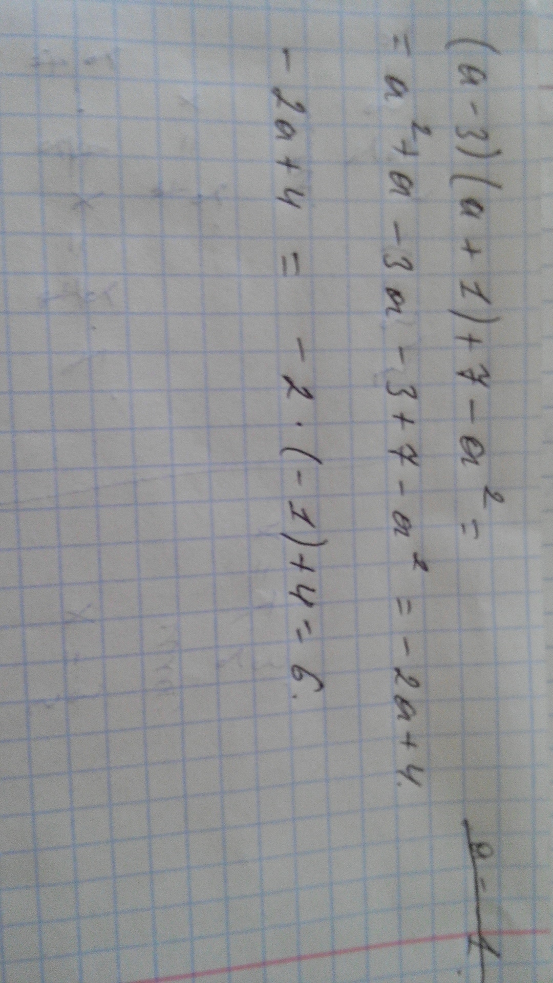 (а-3)(а+1)+7-а^2 = а^2 - 2а - 3 + 7 - а^2 = 4 - 2а