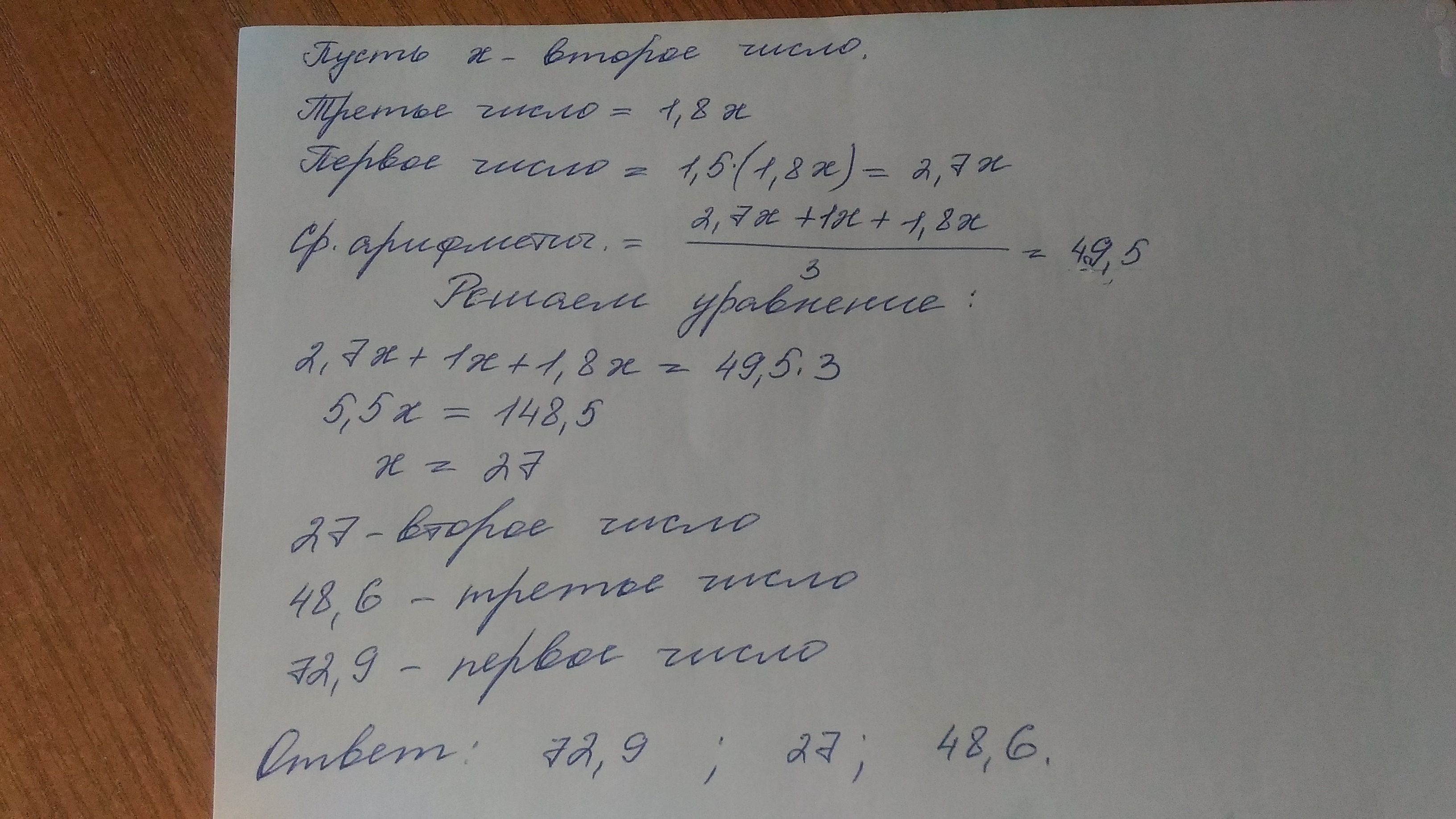 Среднее арифметическое трех чисел 49,5. Второе число в 1,8 раза меньше третьего, а третье меньше первого в 1,5 раза. Найти эти числа.