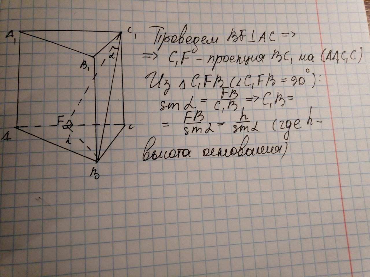 В правильной треугольной призме диагональ бокой грани составляет со смежной бокой гранью угол Альфа. Высота оснавания призмы равна h. Найдите длину диагонали боковой грани призмы.