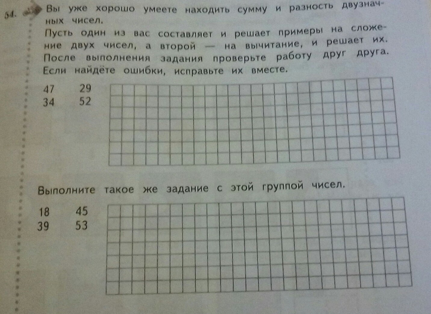 вы уже хорошо умеете находить сумму и разность двузначных чисел Пусть один из вас составляет решает примеры на сложение двух чисел а 2 на вычитание и решает их После выполнения заданий проверьте работу друг друга Если найдёте ошибки исправьте их вместе