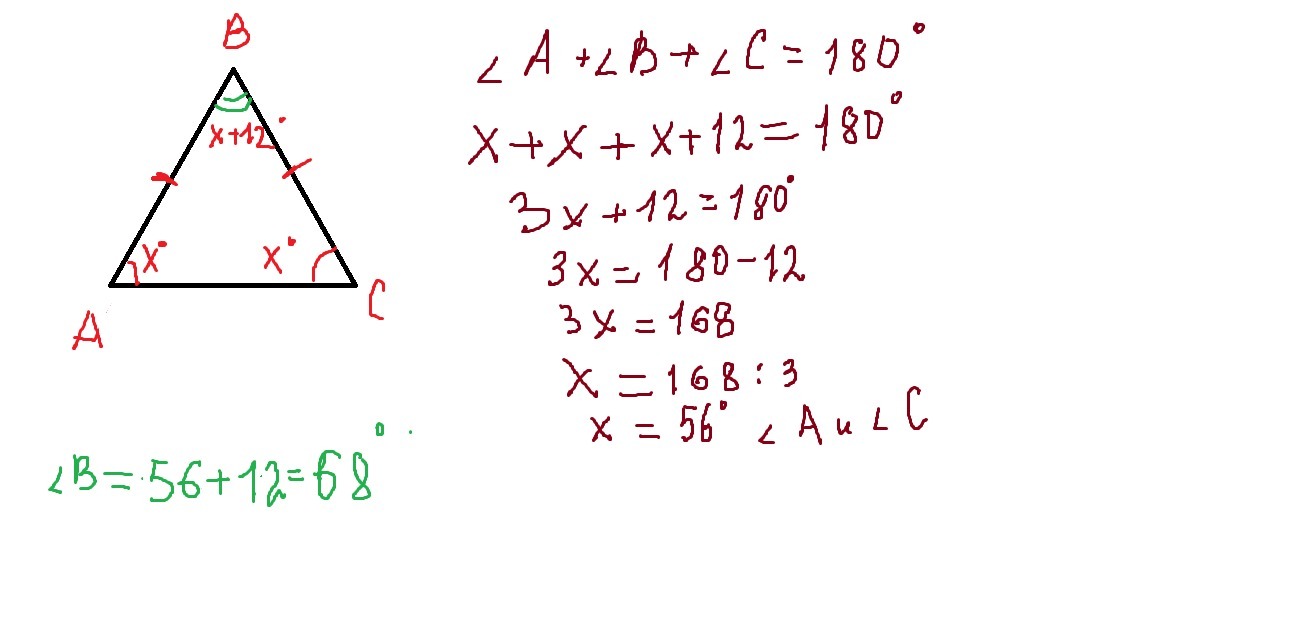 Кут при вершині рівнобедриного трикутника на 12 градусів більший за кут при основі. Знайдіть кути цього трикутника