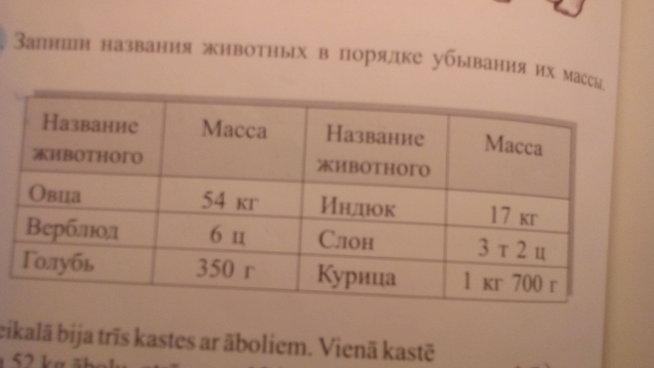 Слон=3 т 2 ц, верблюд=6 ц, овца=54 кг, индюк=17 кг, курица=1 кг 700 г, голубь=350 г.