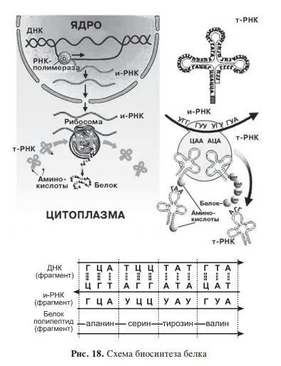 Для этого в ядре с нужной ДНК с нужного ее участка копируется информация. Это происходит так. Молекула ДНК специальными ферментами расшивается на 2 цепи и на одной из ее цепей строится молекула матричной РНК, комплементарной данному участку ДНК. Эта иРНК несет информацию о первичной структуре белка, который надо построить и является копией участка ДНК. Кодирующая последовательность мРНК определяет последовательность аминокислот полипептидной цепи белка. Процесс называется транскрипцией
