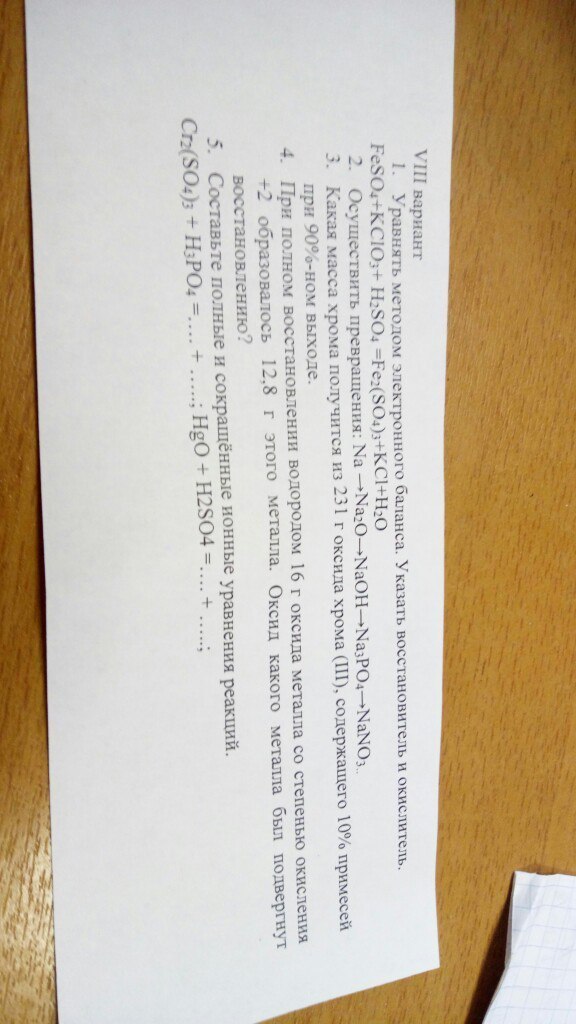 Уравнять методом электронного баланса. Указать восстановитель и окислитель. FeSO4+KClO3+H2SO4=Fe2(SO4)3+KCl+H2O (1 задание)