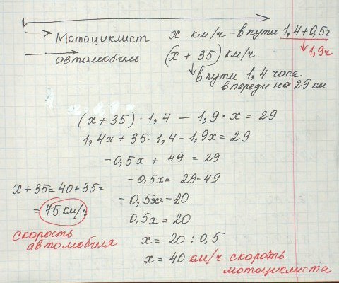 Из города выехал мотоциклист, а через 0,5 часа вслед ему отправился автомобиль, скорость которого на 35 км / ч больше скорости мотоциклиста. Через 1,4 часа после его отъезда автомобиль уже опережал мотоциклиста на 29 км. Найдите скорость мотоциклиста и автомобиля.