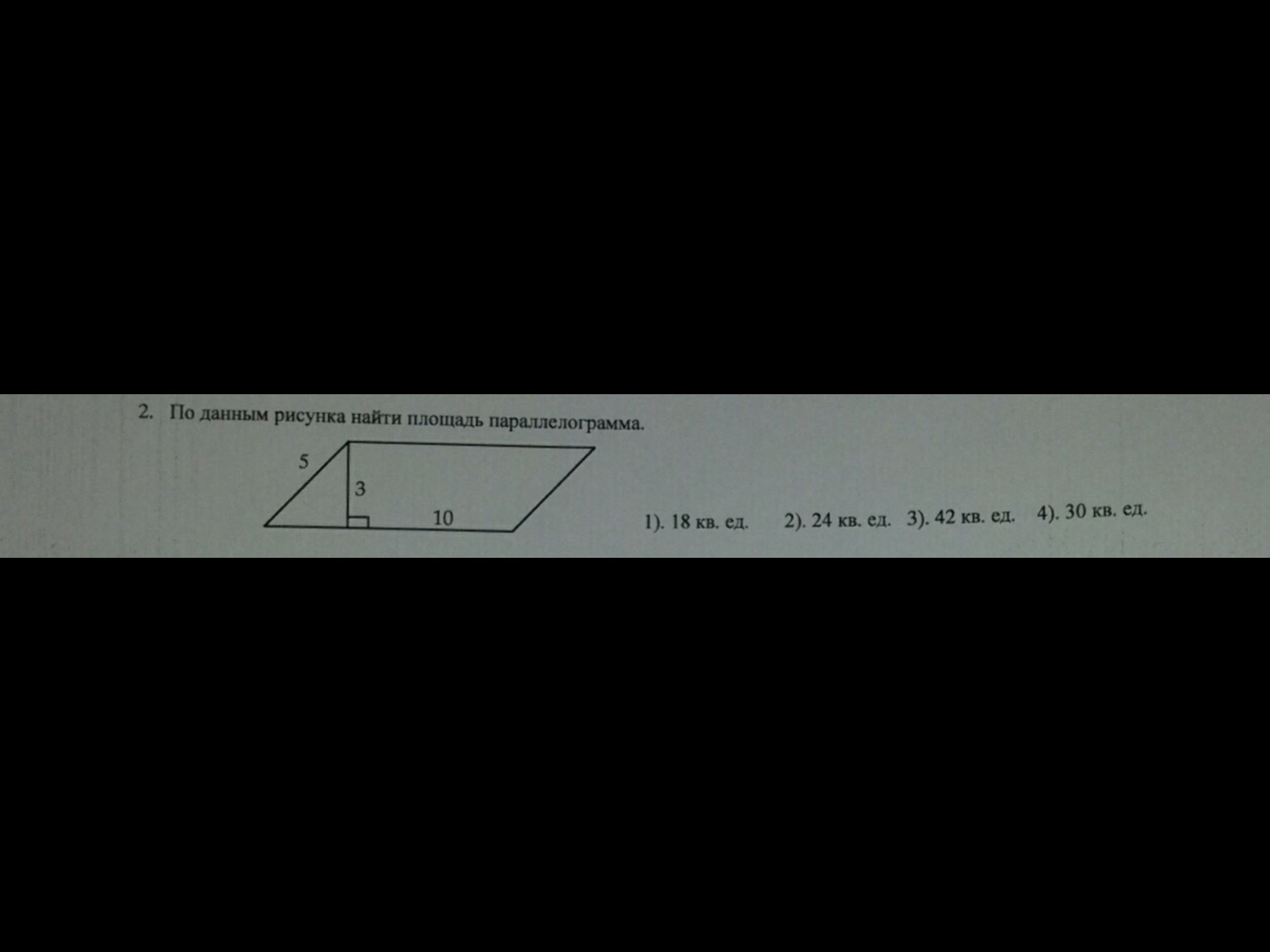 Дано: АBCD- параллелограмм; AB = 5, AD = 10. Н-ти: S параллелограмма. Р-ние: проводим высоту BN = 3. S = ADхH. Н высота. 10х3 = 30 (кв.од.)