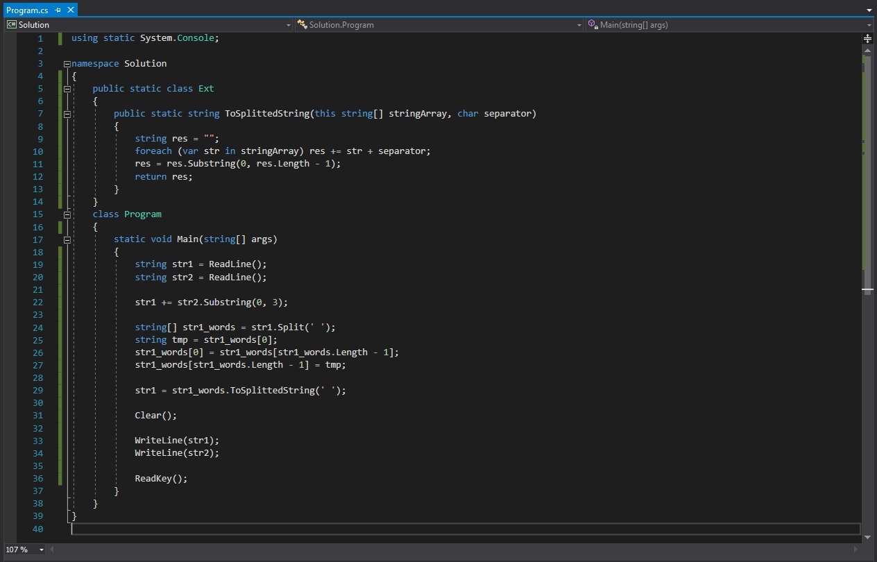 Помогите сделать задание на C# Заданы 2 строки, состоящие из слов, разделенных пробелами. Приписать три символа второй строки к первой. Поменять местами в измененной первой строке первое и последнее слово.