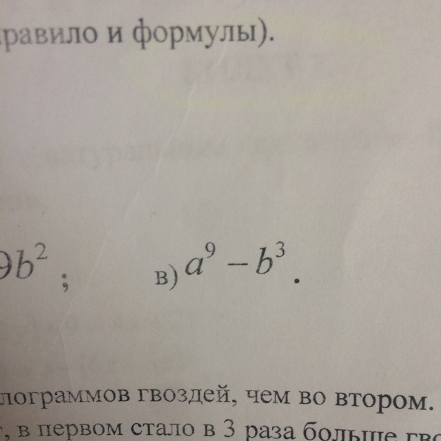 a^9-b^3=(a^3)^3-(b)^3=(a^3-b)(a^6+a^3b+b^2). при решении используем формулу разность кубов.