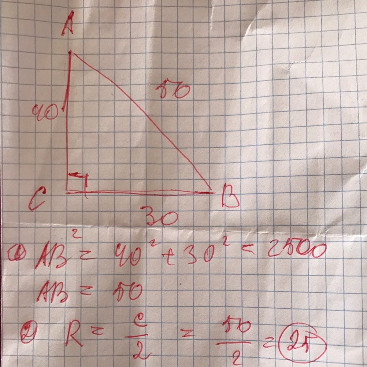 По теореме Пифагора находим с. Дальше по формуле радиуса(опис)-с/2