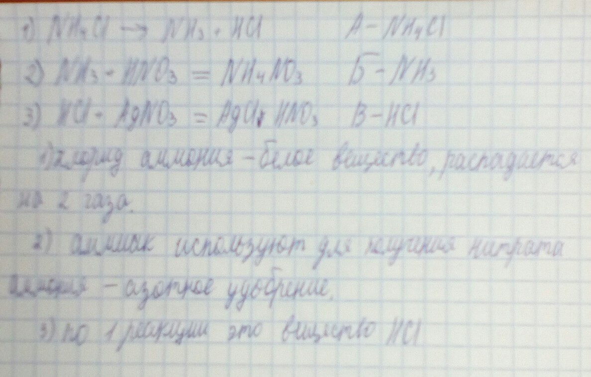 Белое твердое вещество А при нагревании разлагается, минуя стадию плавления, на два бесцветных газообразных вещества Б и В. Вещество Б, соединяясь с кислотами, образует соли, которые используются как удобрения. Вещество В при пропускании через раствор нитрата серебра образует белый творожистый осадок. Определите все вещества и напишите уравнения реакций.