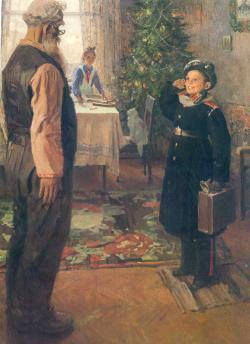 Автор картины Ф. П. Решетников достоверно запечатлел привлекательные черты мальчика, которого радует встреча с родными, приближение Нового года, картина на стене, ковёр в центре комнаты, кот на стуле и даже вязаный половик у порога. Считаю, что это полотно тоже доставляет зрителю радость.