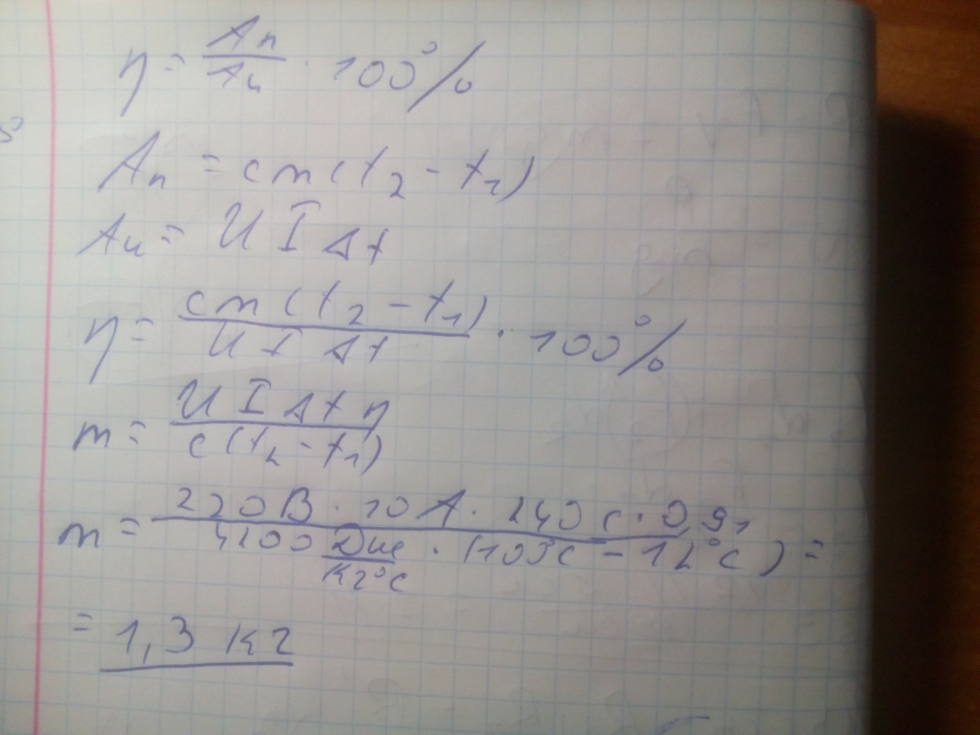 плиз помогите у меня кр по этой задаче?!!! В електричний чайник налили воду за температури 12°.Через 4 хв.після ввімкнення чайника вода закипіла.Визначте масу води,якщо ККД чайника-91 відсоток,сила струму в його нагрівальному елементі-10А,напруга в мережі-220В