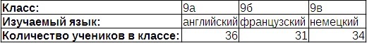 в некоторой школе имеется три параллельных 9х класса ученики одного класса изучают английский язык другого французкий а третьего немецкий .в первом из названных классов обучается 36 во втором 31 в третьем 34 ученика каждый ученик изучает только один иностранный язык составьте таблицу показывающую эту информацию