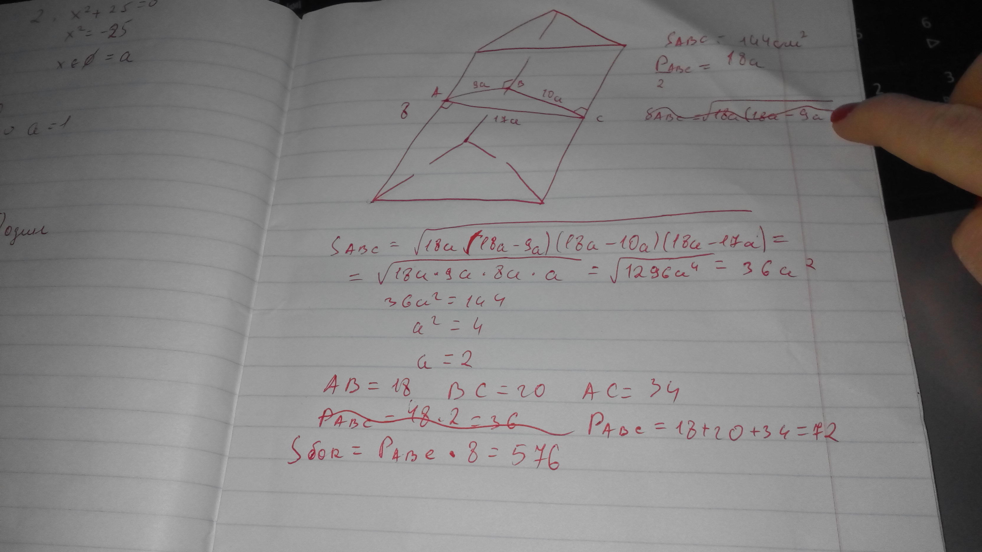 В наклонной треугольной призме боковые рёбра содержат по 8 см; стороны перпендикулярного сечения относятся как 9:10:17, а его площадь равна 144 см2. Определить боковую поверхность этой призмы.