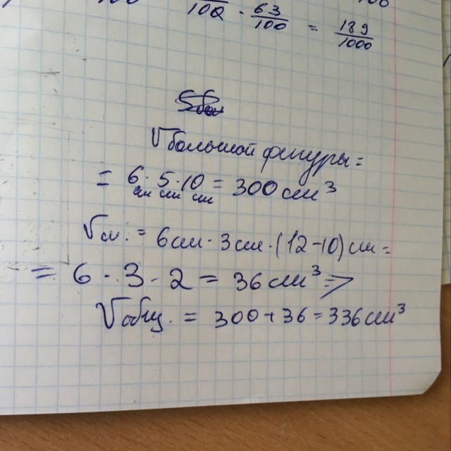 Сначала находишь объём большой фигуры, потом той маленькой сверху( 1 и 2 действия), потом складываешь