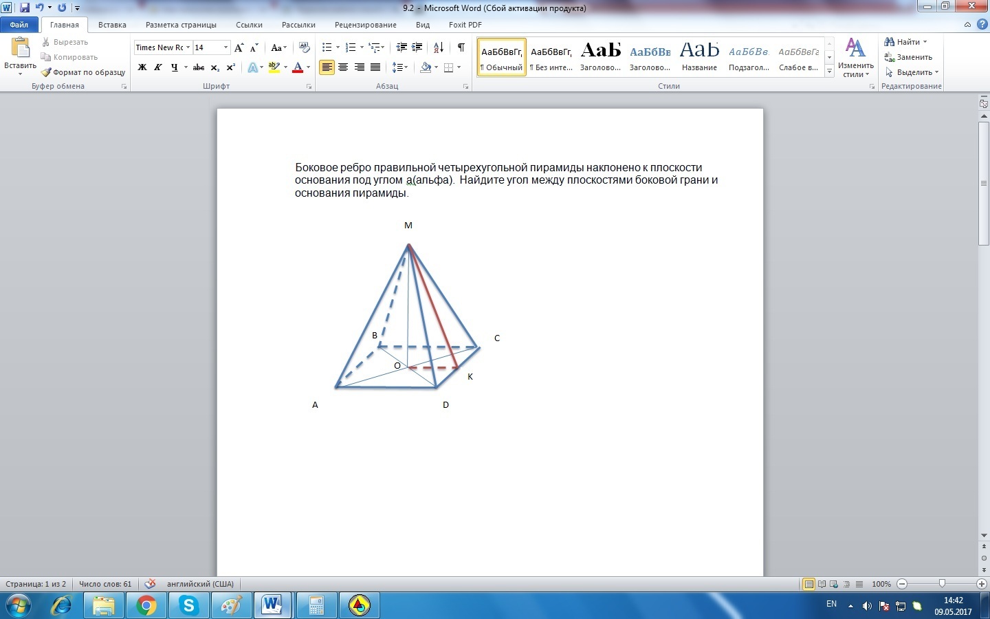 Боковое ребро правильной четырехугольной пирамиды наклонено к плоскости основания под углом а(альфа). Найдите угол между плоскостями боковой грани и основания пирамиды.