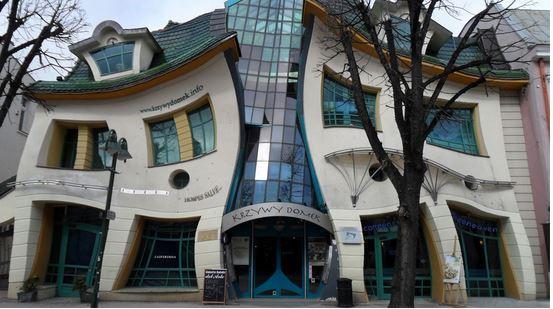 *«Кривой Домик» (Krzywy Domek) был построен в 2004 году в Сопоте, в Польше. Он был спроектирован двумя архитекторами, которые черпали вдохновение из иллюстраций детской книги. У здания искривленные стены, окна с отделкой из песчаника и изогнутые архитектурные витражи. Дом увенчан изогнутой крышей с сине-зеленой глазированной черепицей, чтобы создавать впечатление дракона из мультфильма. Этот дом — популярная среди туристов достопримечательность, в нем расположены магазины, офисные помещения, рестораны и бары.