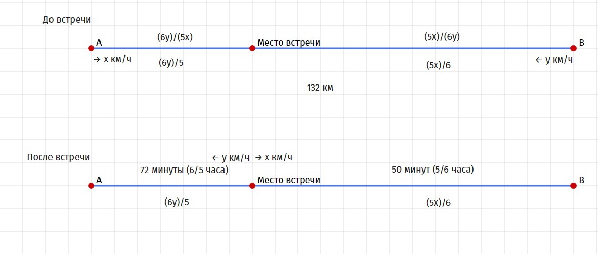 Рассмотрим ситуацию после встречи: 1 автобус проехал оставшееся расстояние за 5/6 часа со скоростью х. Пройденное расстояние равно (5х)/6.Данное расстояние равно расстоянию пройденному вторым автобусом до встречи.2 автобус проехал оставшееся расстояние за 6/5 часа со скоростью у. Пройденное расстояние равно (6у)/5.Данное расстояние равно расстоянию пройденному первым автобусом до встречи.В сумме расстояния равны 132.