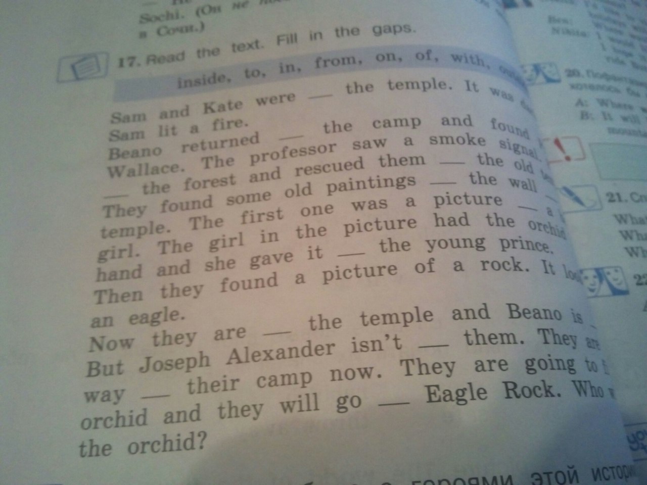 Сейчас они вне храма, а Бино с Сэмом. Но Джозеф Александр не с ними. Сейчас они далеко от своего лагеря. Они собираются найти орхидею и пойти к Орлиному Камню. Кто же найдет орхидею?