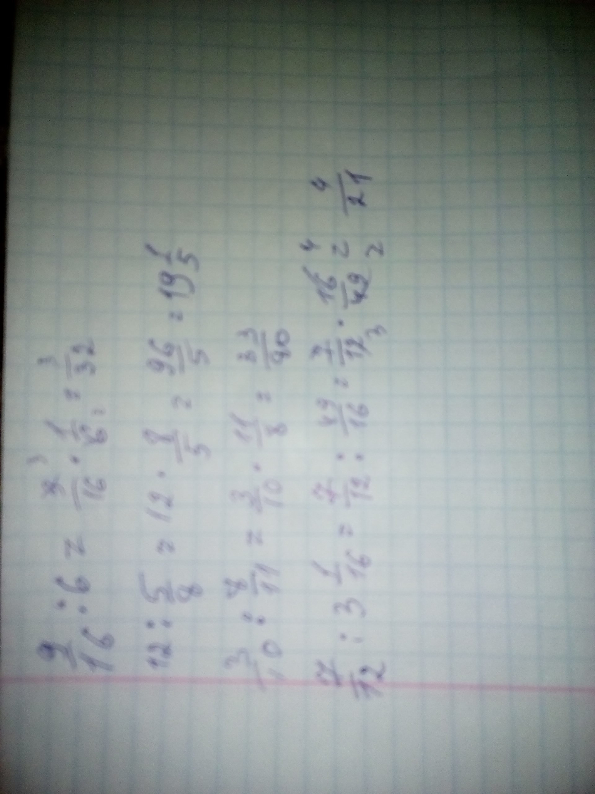 Замените частные равным ему произведением. 9/16 разделить на 6. 12 разделить на 5/8. 3/10 разделить на 8/11. 7/12 разделить на 3 1/16.