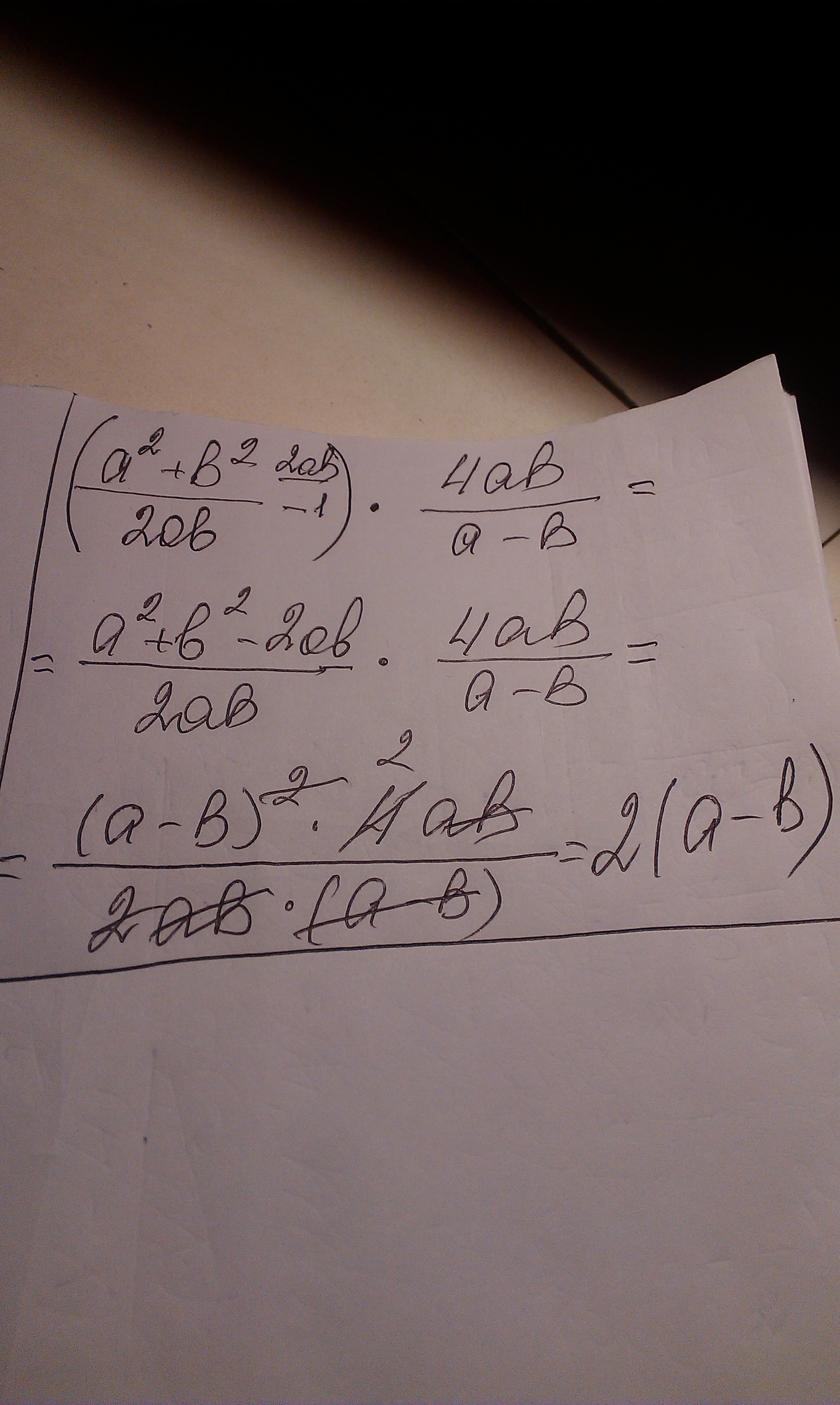 a^2+b^2-2ab/2ab *4ab/a-b=(a^2-2ab+b^2)*2/a-b=(a-b)^2*2/a-b=(a-b)*2=2a-2b