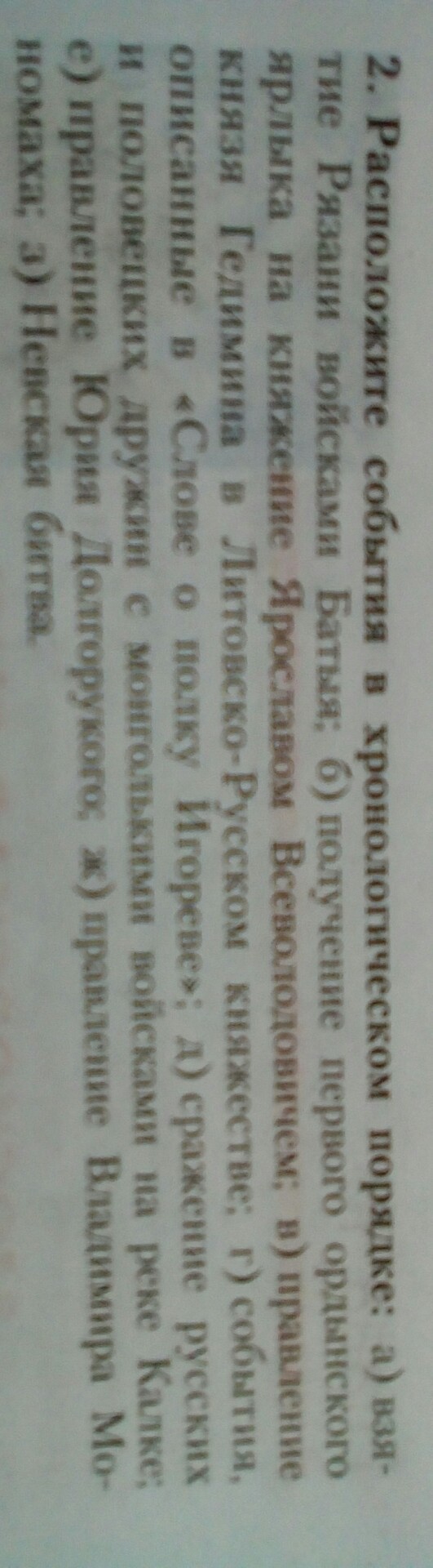 2. Расположите события в хронологическом порядке: а) взятие Рязани войсками Батыя; б) получение первого ордынского ярлыка на княжение Ярославом Всеволодовичем; в) правление князя Гедимина в Литовско-Русском княжестве; г) события описанные в "Слове о полку Игореве"; д) сражение русских и половецких дружин с монгольскими войсками на реке Калке; е) правление Юрия Долгорукого; ж) Правление Владимира Мономаха; з) Невская битва