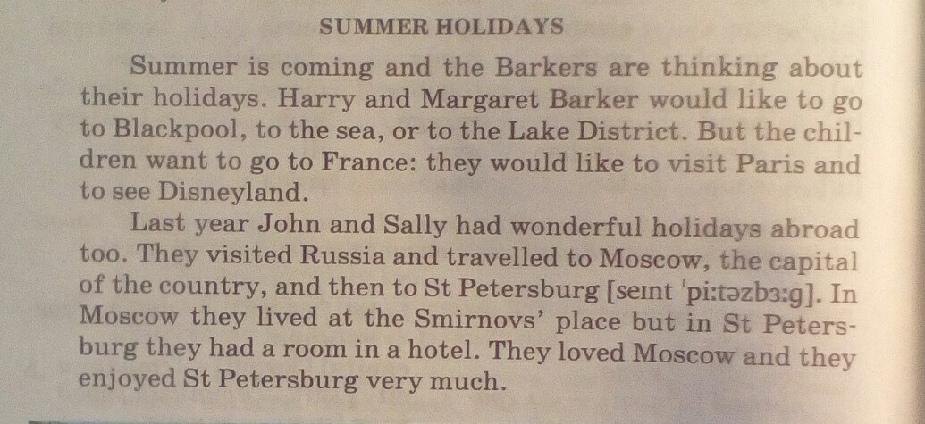 В прошлом году Джон и Салли тоже провели замечательные выходные за границей. Они посетили Россию и путешествовали по Москве, столице страны, далее они отправились в Санкт-Петербург. В Москве они жили у Смирновых, но в Санкт-Петербурге у них была комната в отеле. Им очень понравились Москва и Санкт-Петербург.