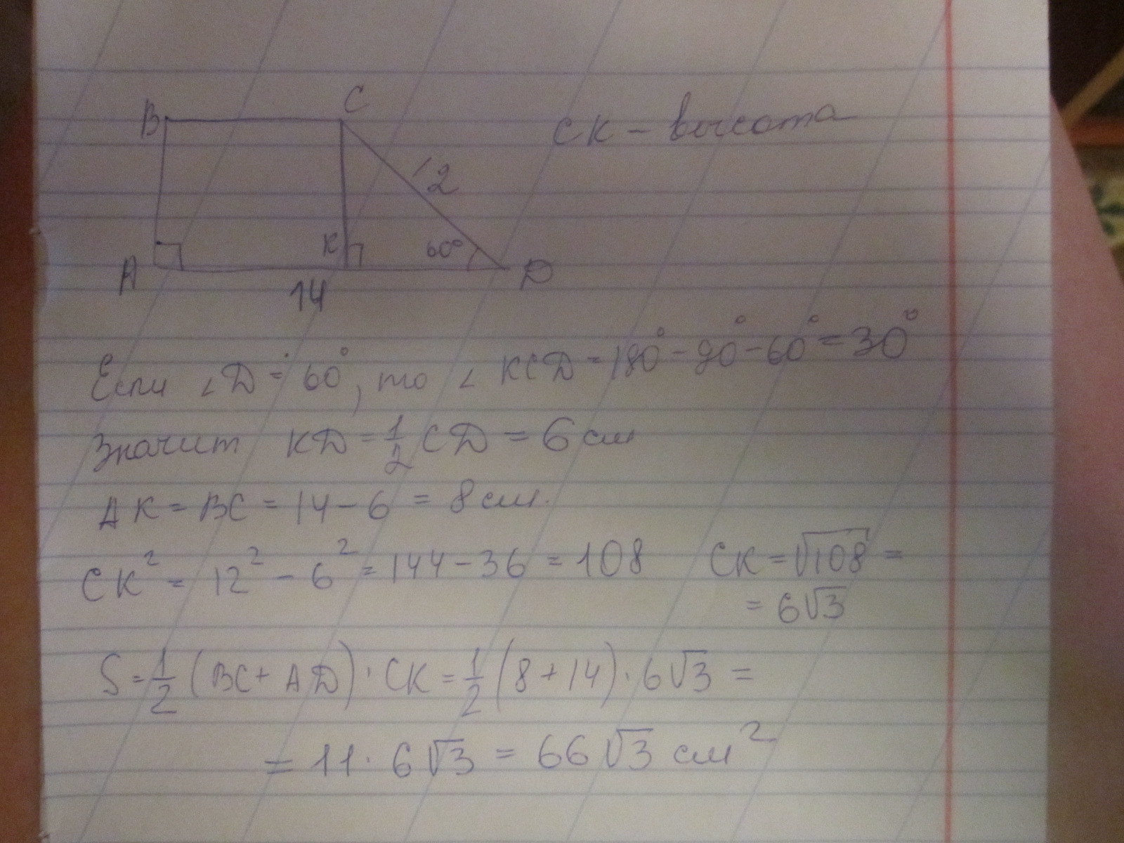 Найти площадь прямоугольной трапеции, большая основа которой 14 см, большая боковая сторона 12 см, а острый угол - 60 градусов. (Еще, если не сложно, нужен рисунок)