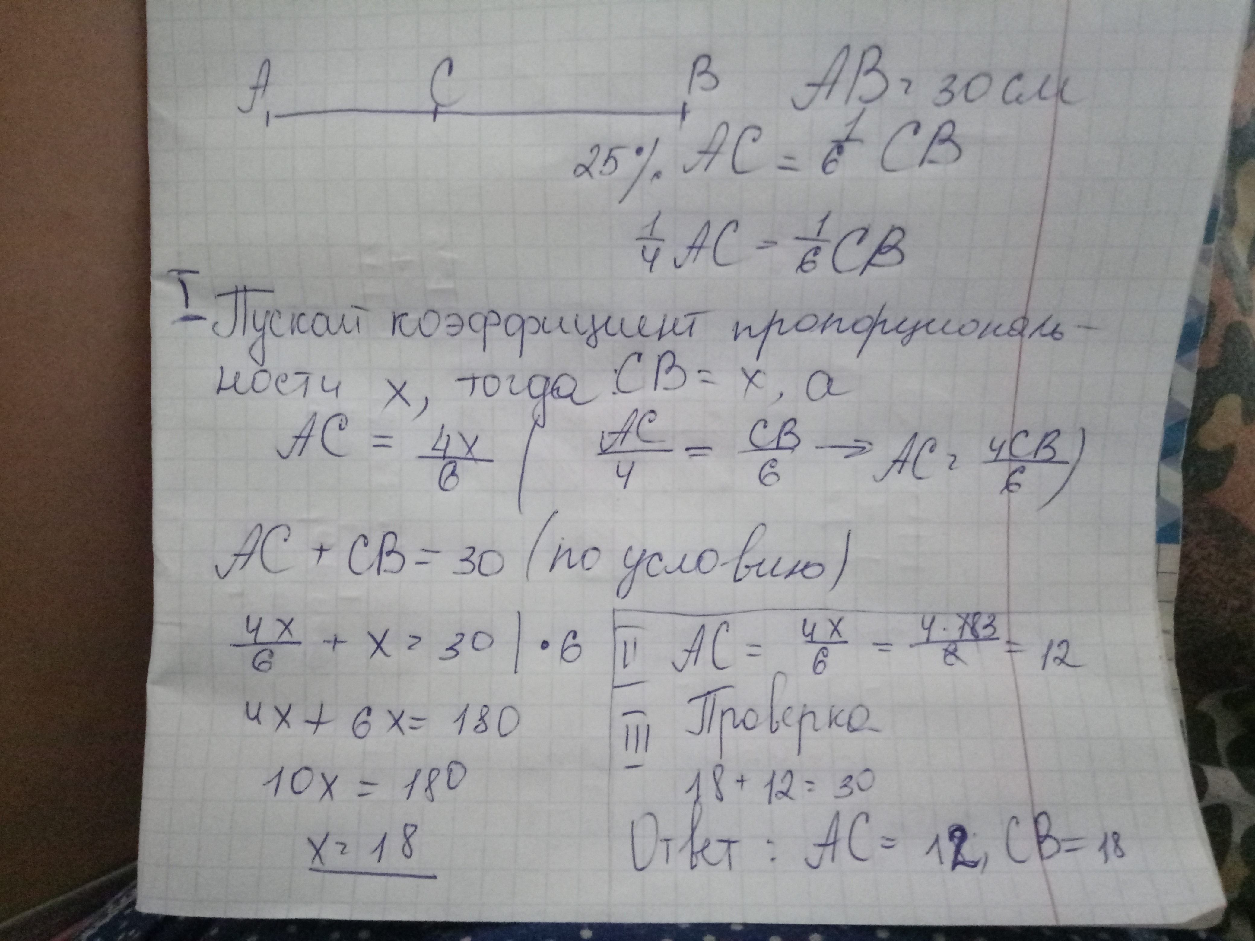 Длина отрезка АВ равна 30 см. Точка С делит отрезок АВ на отрезке АС и СВ, причем 25 % длины отрезка АС равно одна шестая длины отрезка СВ. Найдите длину отрезка АС.