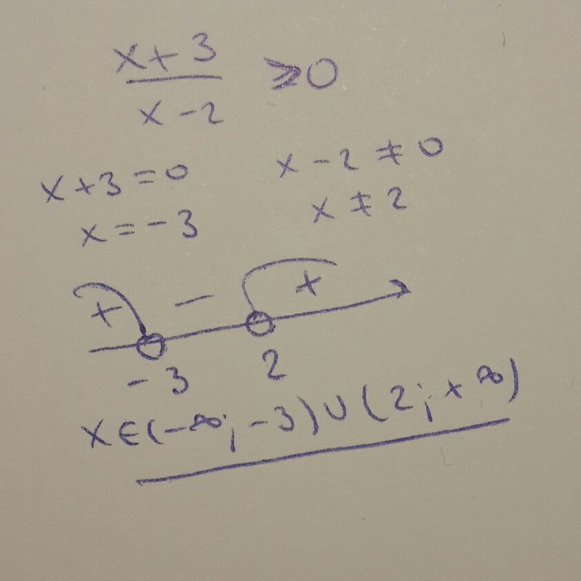 приравниваем дробь к нулю. Так как знак строгий, точки выколотые (незакрашенные). Отмечаем их на коордионатной прямой и определяем знаки (для этгого достаточно взять любое число, больше 2, например, и подставить в неравенство, смотрим по знаку). Ответ на фото