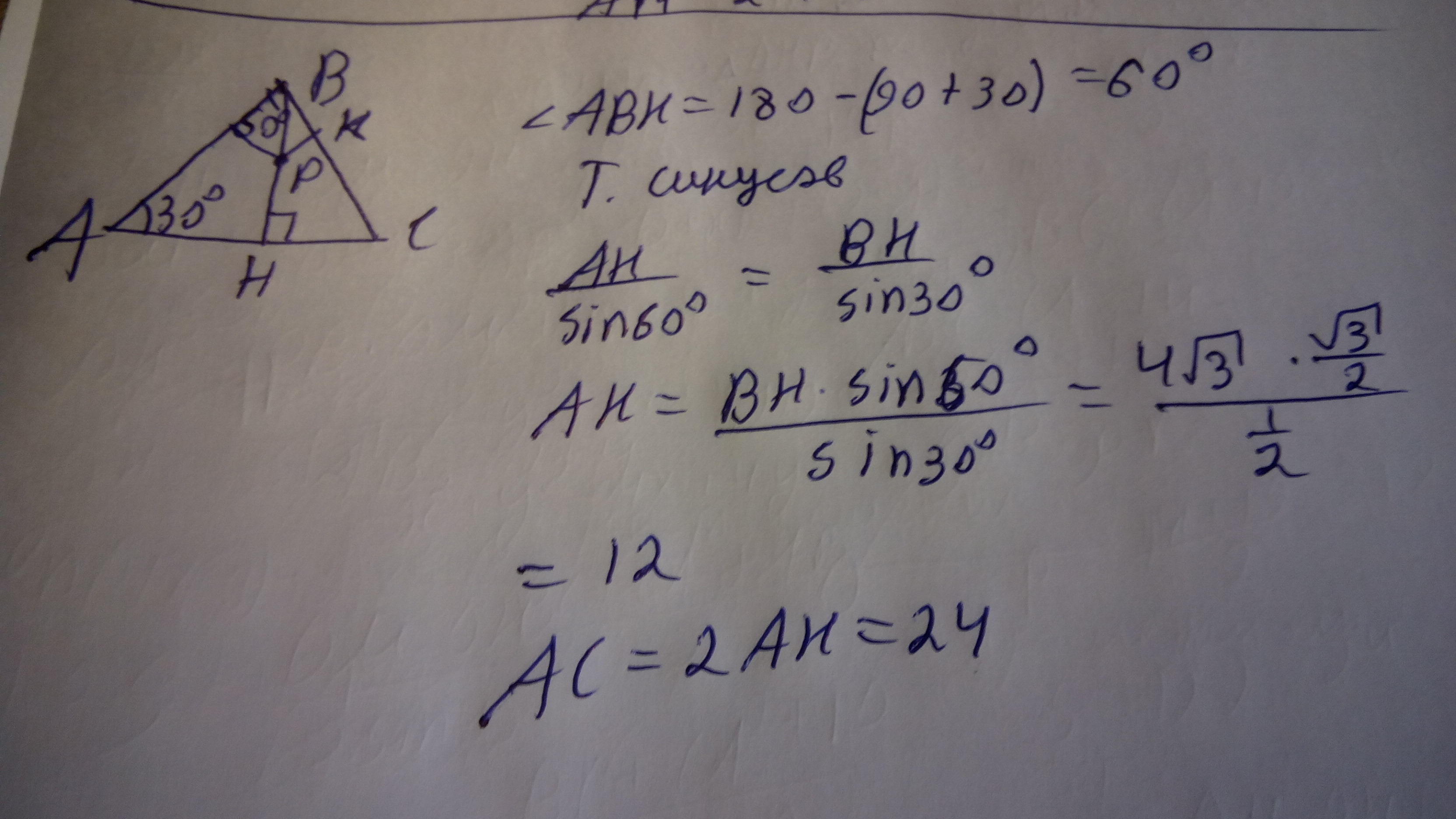 Найдите основание равнобедренного треугольника, если угол при основании равен 30º, а взятая внутри треугольника точка находится на одинаковом расстоянии, равном 3, от боковых сторон и на расстоянии 2√3 от основания.
