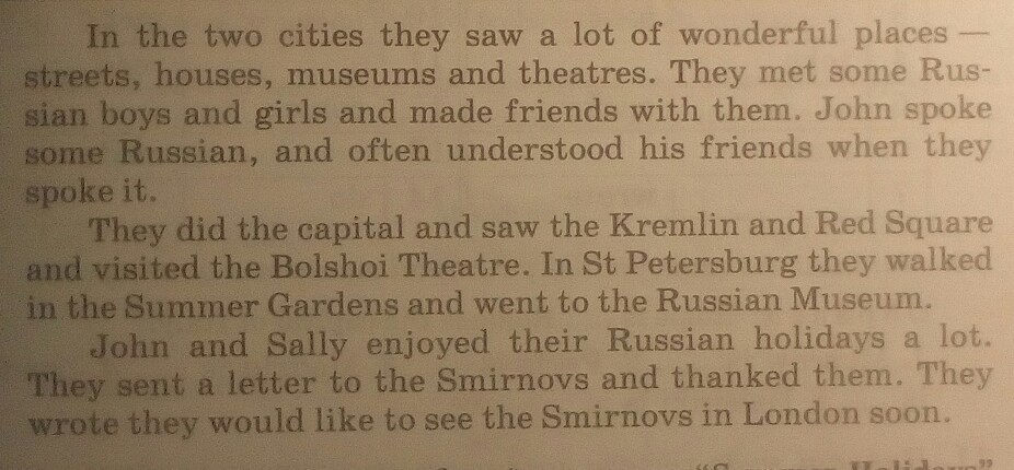 В двух городах они увидели много прекрасных мест, улиц, домов, музеев и театров. Они встретили русских мальчиков и девочек и подружились с ними. Джон говорил по-русски и часто понимал своих друзей, когда они говорили на нем. Они проехали столицу, осмотрели Кремль и Красную площадь, побывали в Большом театре. В Санкт-Петербурге они ходили в Летнем саду и посещали Русский музей. Джон и Салли наслаждались российскими праздниками. Они отправили письмо Смирнову и поблагодарили его. Они писали, что хотели бы вскоре увидеть Смирнова в Лондоне.