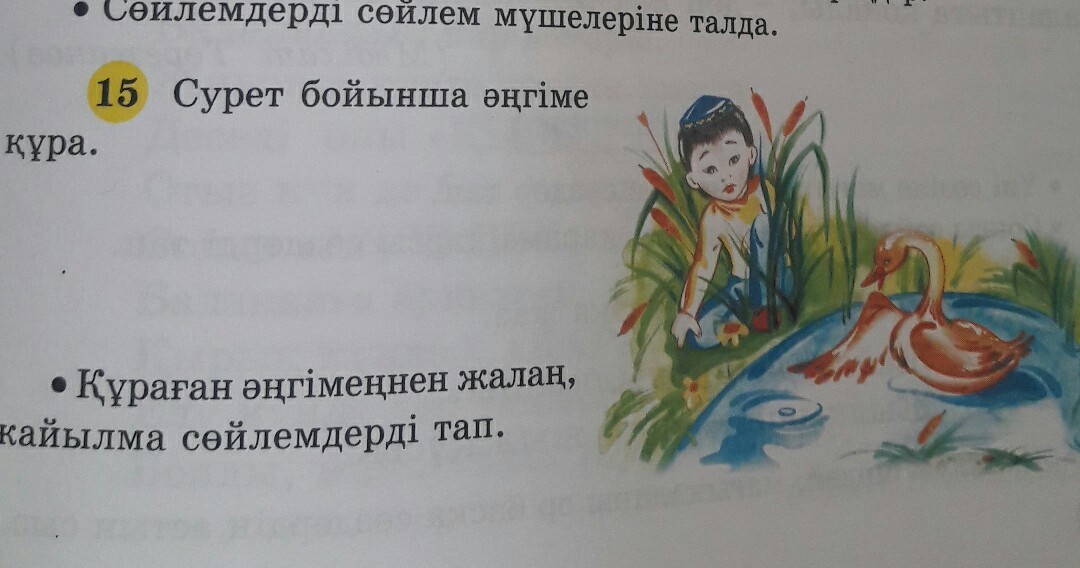 15 жаттығу 215 бет. 3 сынып Сурет бойынша әңгіме кұра. Құраған аңгімеңнен жалаң жайылма сөйлемдерді тап.