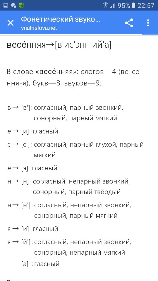Слово «весенняя» содержит 8 букв, 4 слога, 9 звуков, транскрипция слова - [в'ис'энн'ий'а], часть речи: прилагательное. Ударение в слове — весе́нняя.