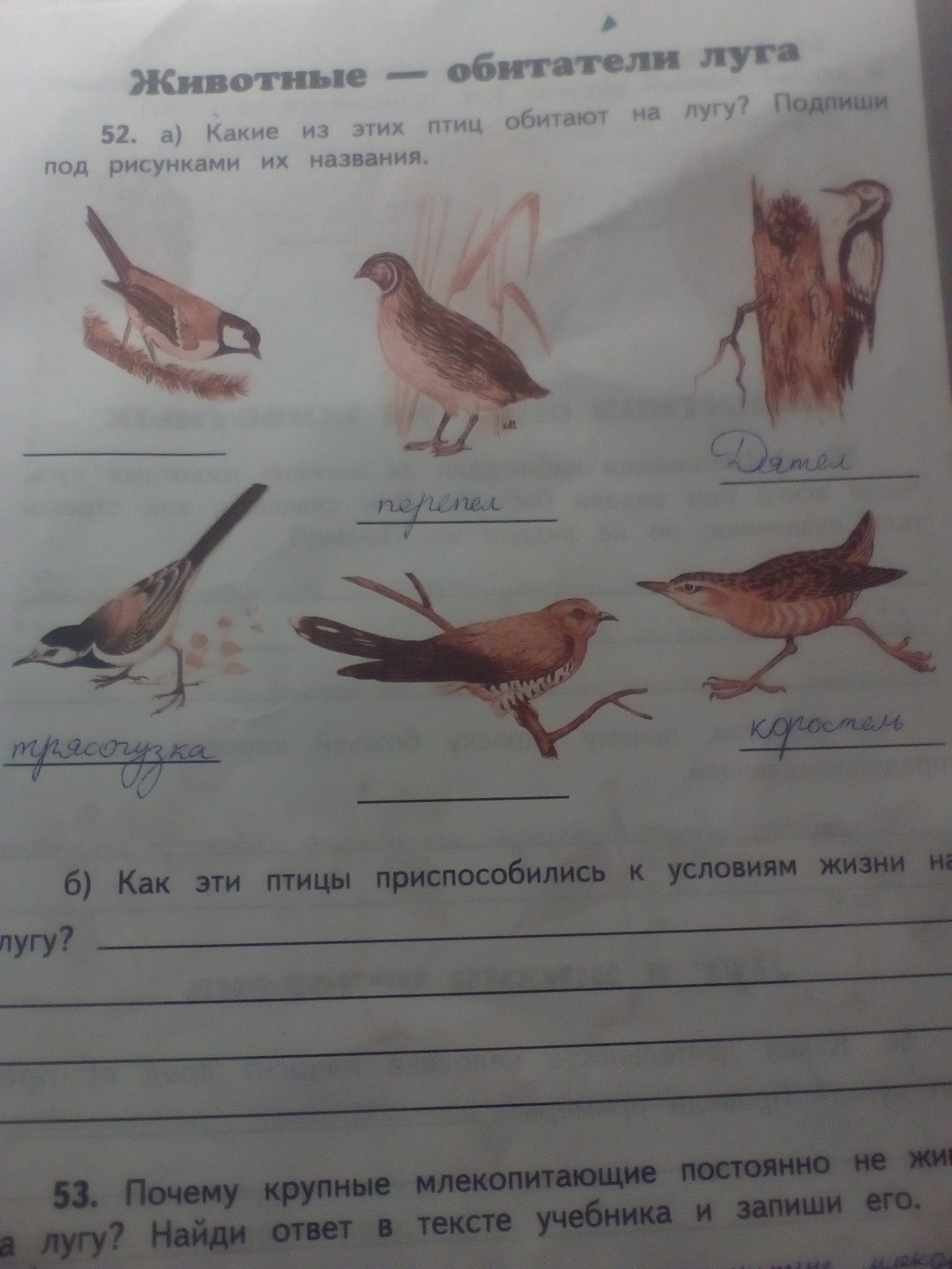 Какие из этих птиц обитают на лугу ? Подпиши по картинками их названия.