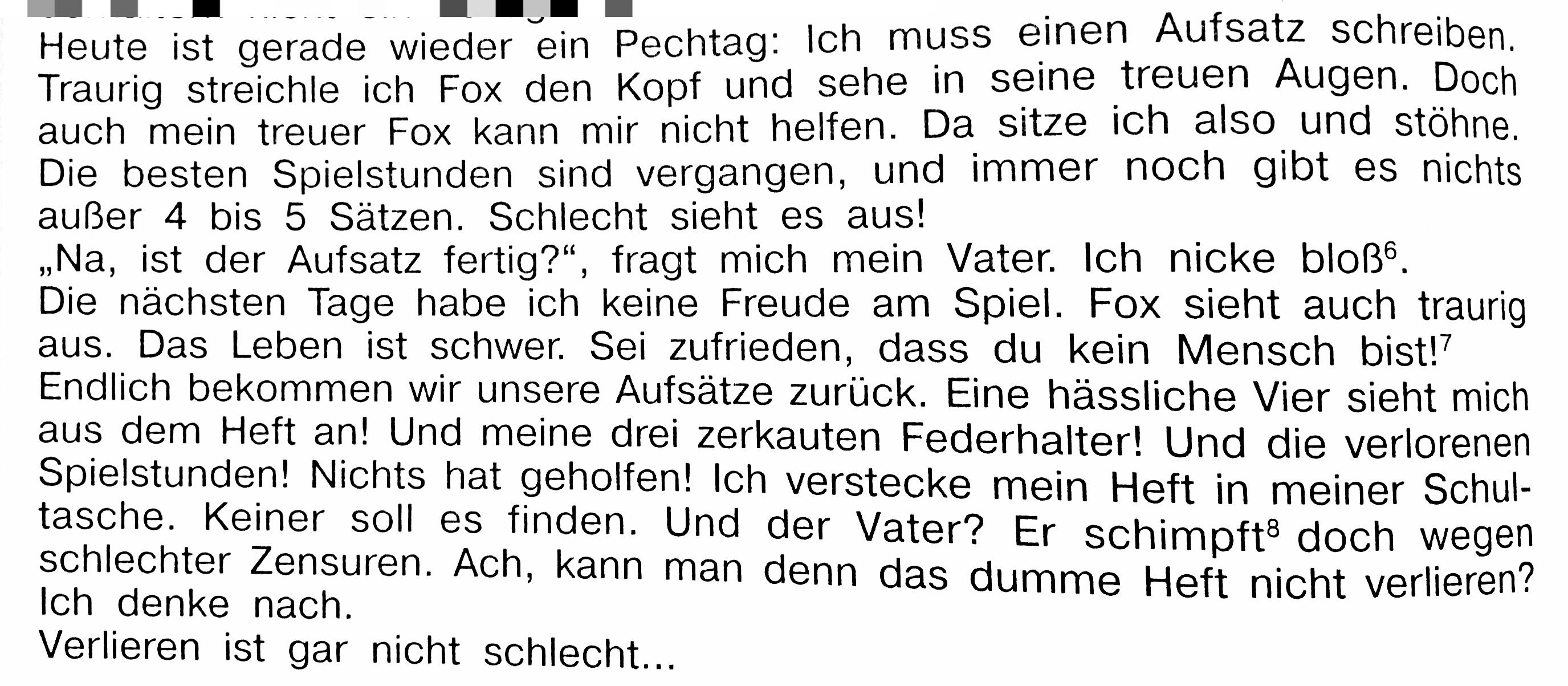 Ну, сочинение готово? - спрашивает меня мой отец. Я только киваю. Следующие дни я не имею радости в игре. Фокс выглядит также печальным. Жизнь тяжелая. Будь довольный, что ты не человек. Наконец получаем мы наши сочинения назад. Мерзкая 4 смотрит на меня из тетради! И мои три пожеванные ручки! И потерянные часы игры! Ничего не помогло. Я прячу мою тетрадь в мою школьную сумку. Никто не должен это найти. А отец? Он же ругается из-за плохих оценок. Ах, нельзя же глупую тетрадь потерять? Я раздумываю.