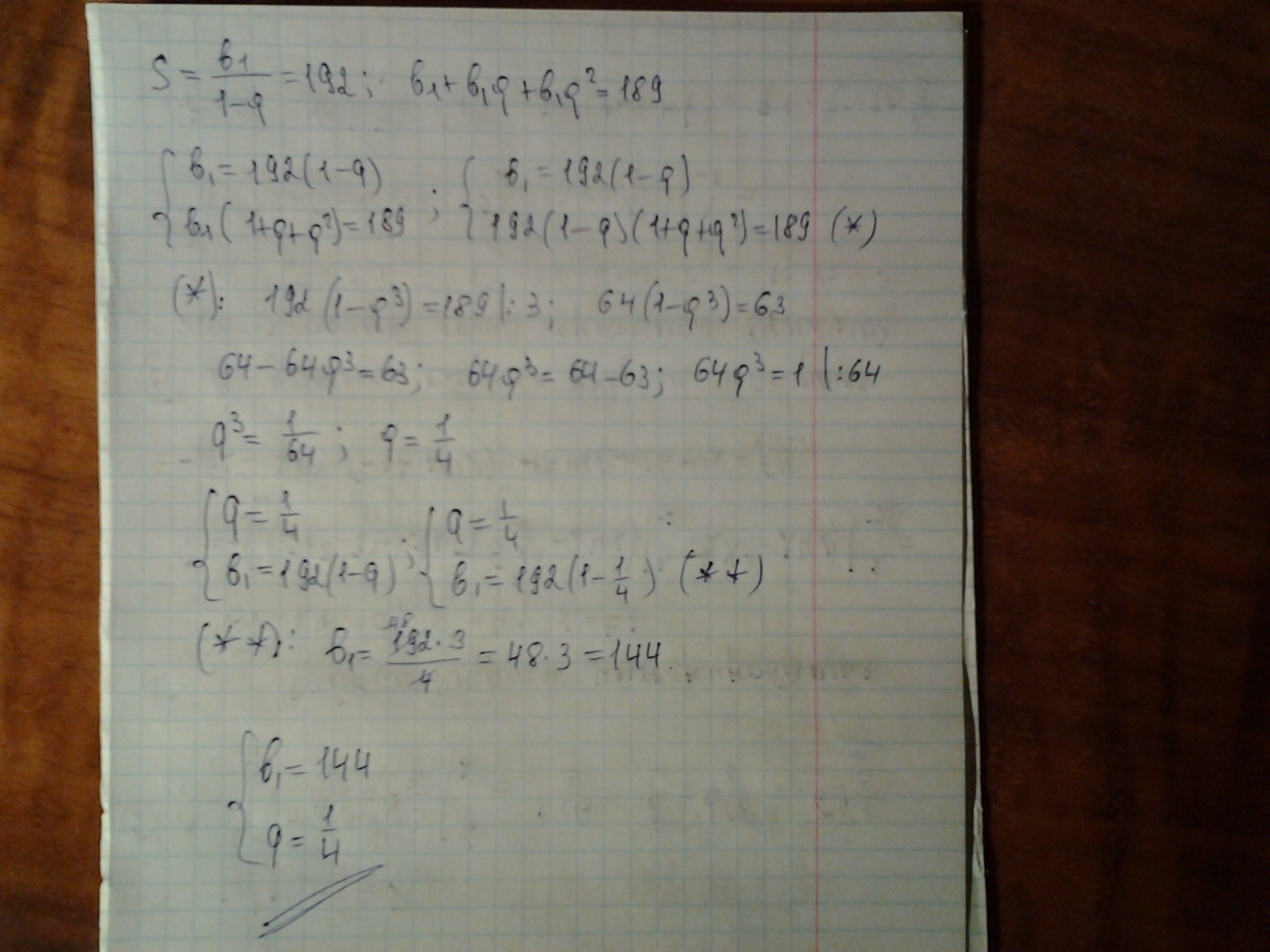 Сумма убывающей геометрической прогрессии ровна 192, а сумма первых трех ее членов 189. Найти первый член(b{1}) и разницу (q)