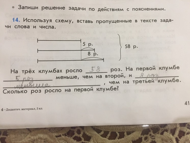 На трех клумбах росло 58 роз. На первой клумбе на 5 роз меньше, чем на второй, и на 8 роз меньше, чем на третьей. Сколько роз росло на первой?