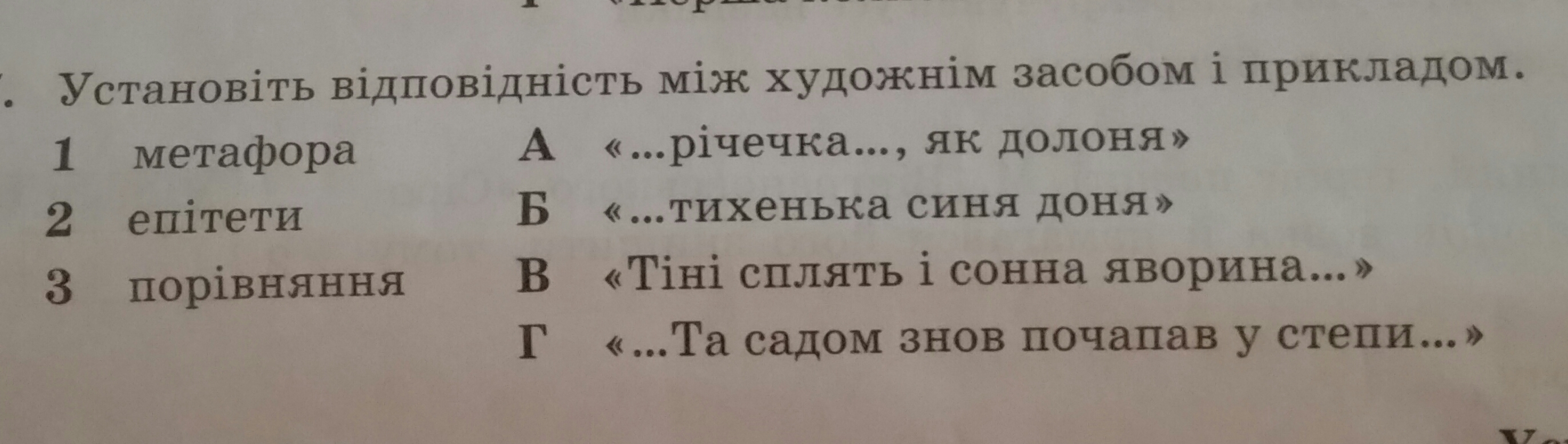 Ця річечка Дніпра тиxенька синя доня (А) Далі: епітети-2 Б порівняння -3А метафора-1В і Г