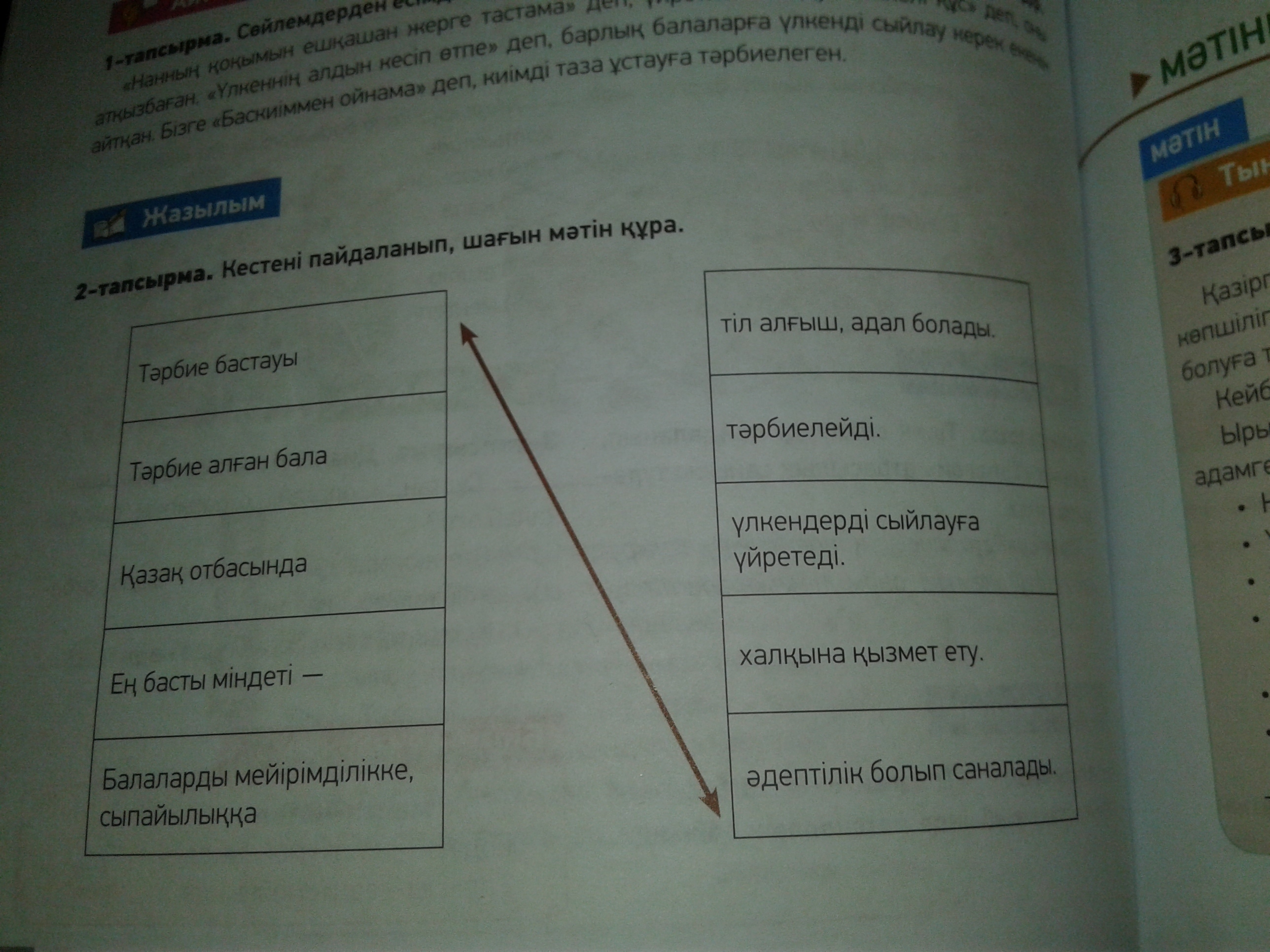 Тарбие бастауы адептилик болып саналады.Тарбие алган бала тил алгыш,адал болады. Казак отбасында улкендерди сыйлауга уйретеди. Ен басты миндет-халкына кызмет ету.Балаларды мейримдиликке, сыпайлыкка тарбиелейди.