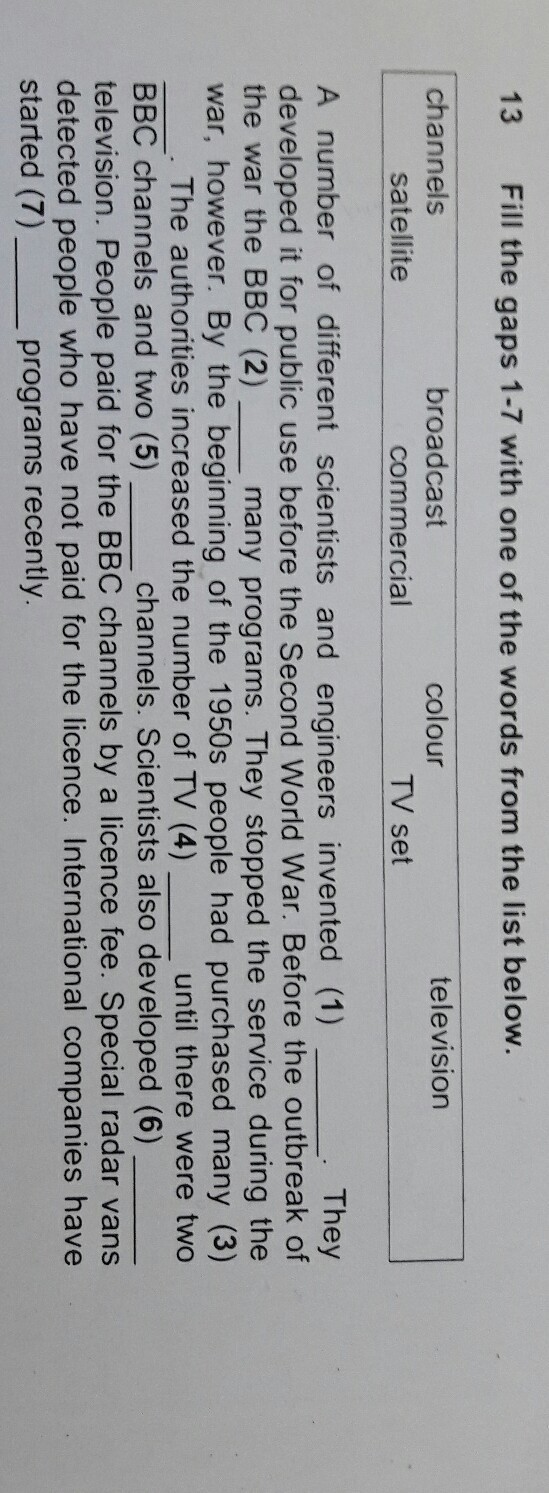 2) broadcast 1) colour 3)tv set 4)commercial 5)satellite