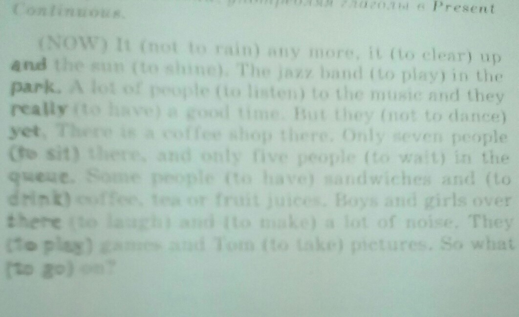 It is not raining any more, it is clearing up and the sun is shining. The jazz band is playing in the park. A lot of people are listening to the music and they are really having a good time. But they are not dancing yet. There is a coffee shop there. Only seven people are sitting there, and only five people are waiting in the queue. Some people are having sandwiches and drinking coffee, tea or fruit juices. Boys and girls over there are laughing and making a lot of noise. They are playing games and Tom is taking pictures. So what is going on?