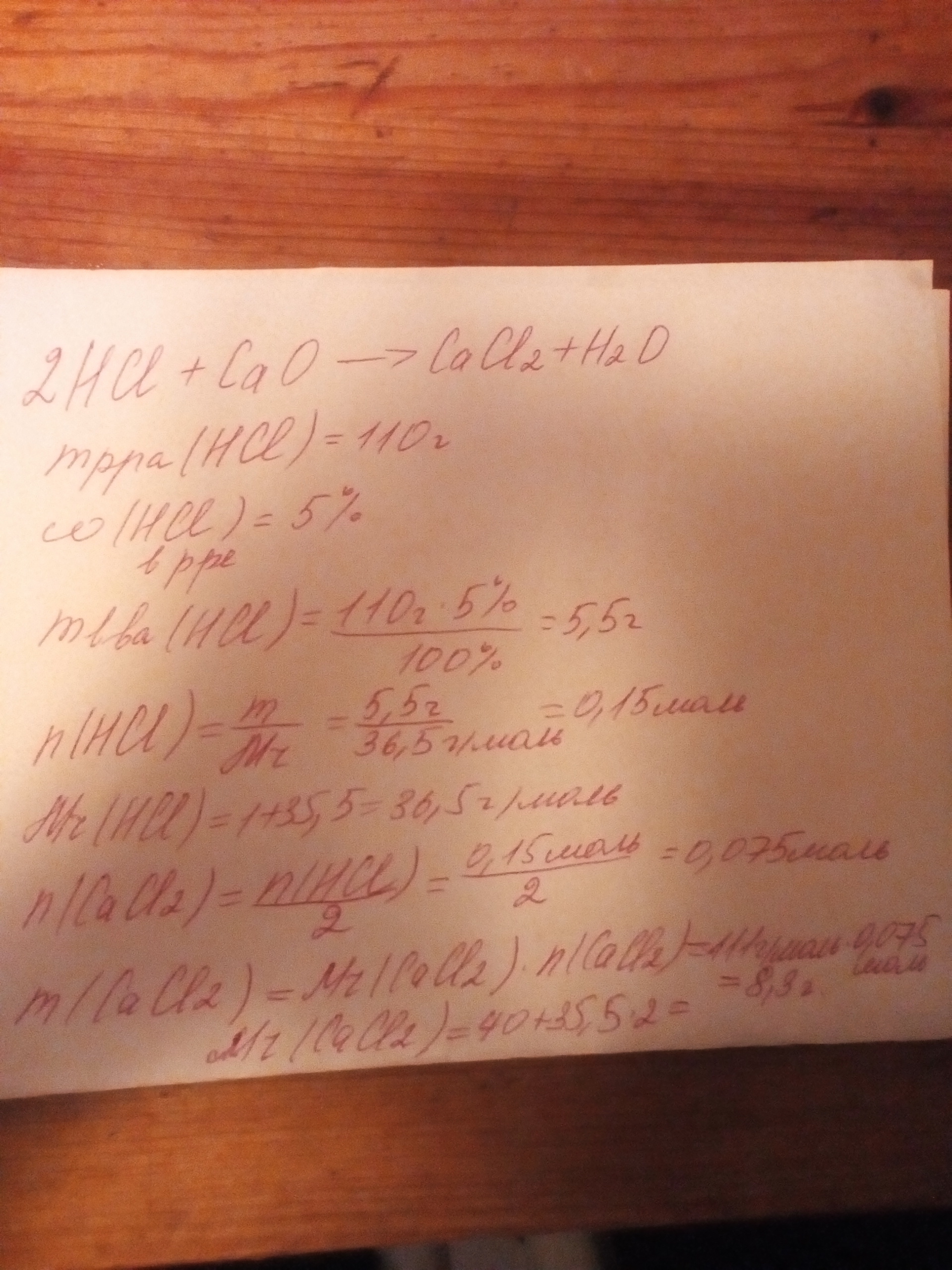 вычислите массу соли образовавшейся при взаимодействии 110 г 5%-ного раствора соляной кислоты с оксидом кальция