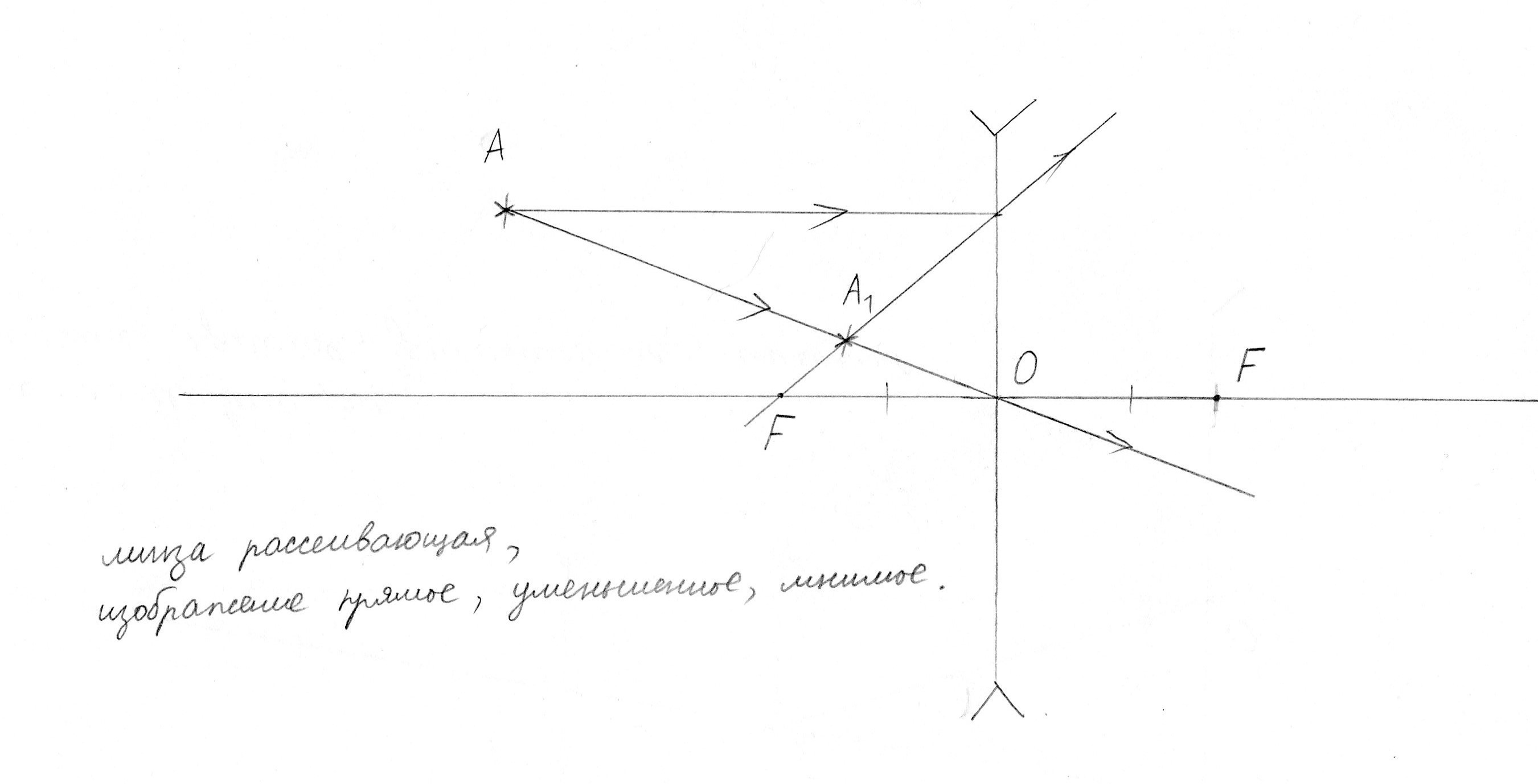 Определите построением, где находится оптический центр тонкой линзы и ее фокусы, если MM - главная оптическая ось линзы, A - светящаяся точка, A₁ - ее изображение. Определите также вид линзы (собирающая или рассеивающая) и тип изображения (прямое или перевёрнутое; увеличенное или уменьшенное; мнимое или действительное)