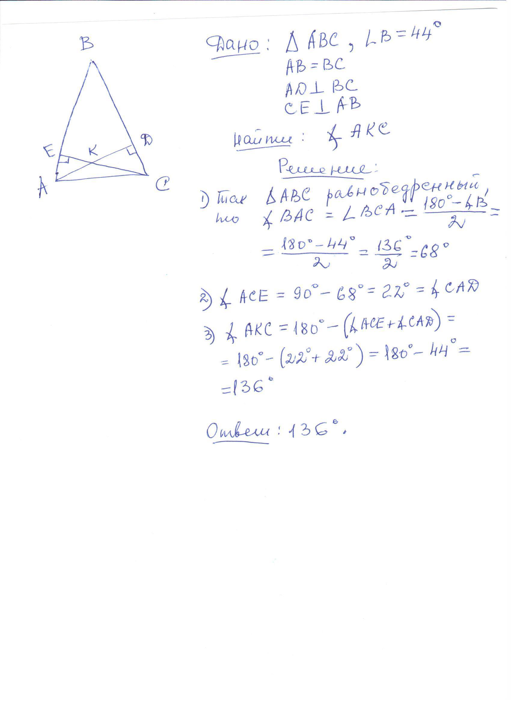 Через вершины основания равнобедренного треугольника проведены высоты к его боковым сторонам. Найдите угол между ними, если угол при вершине треугольника, противолежащей основанию, равен 44°.