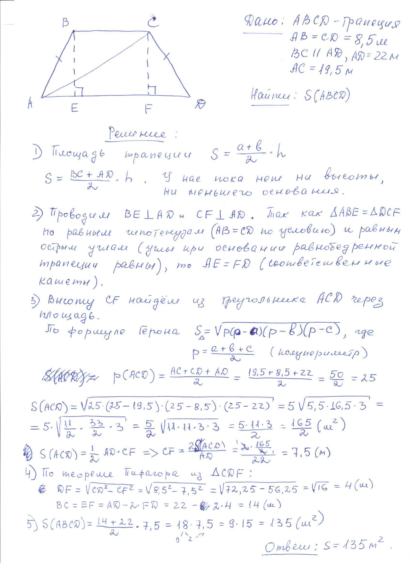 Большее основание равнобедренной трапеции равно 22м,боковая сторона-8,5м а диагональ- 19,5м.Определите площадь трапеции.