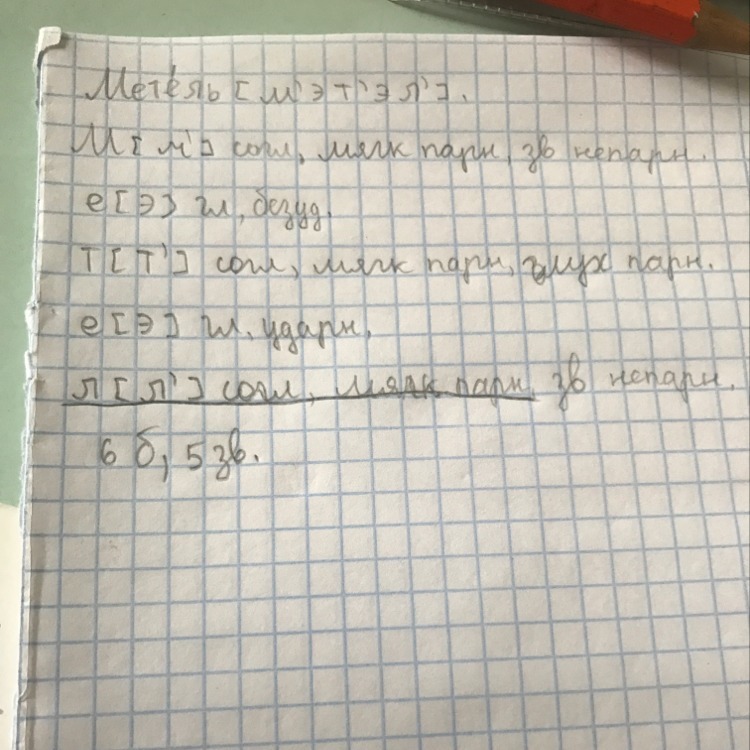 В слове «мете́ль»: слогов—2 (ме-тель), букв—6, звуков—5: