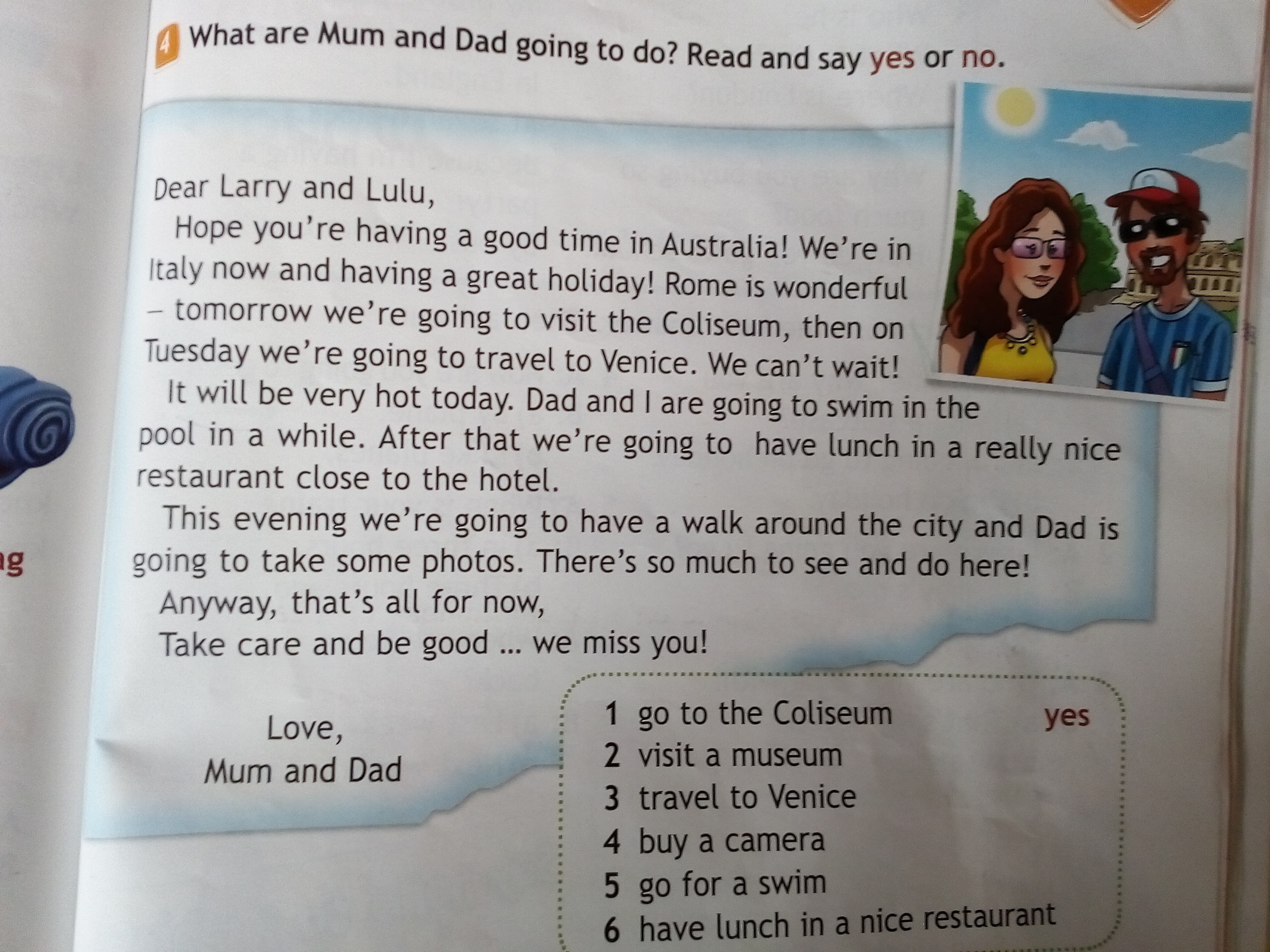 Дорогой Ларри и Лулу, Надеюсь, ты хорошо проводишь время в Австралии! Мы сейчас в Италии и прекрасно проводим отпуск! Рим замечательный завтра мы собираемся посетить Колизей, тогда во вторник мы собираемся поехать в Венецию. Мы не можем ждать! Сегодня будет очень жарко. Папа и я собираемся поплавать в бассейне через некоторое время. После этого мы собираемся пообедать в очень красивом ресторане рядом с отелем. Сегодня вечером мы собираемся прогуляться по городу, и папа собирается сделать несколько фотографий. Здесь есть что посмотреть и чем заняться! В любом случае, пока все. Позаботьтесь и будьте хорошими ... мы скучаем!